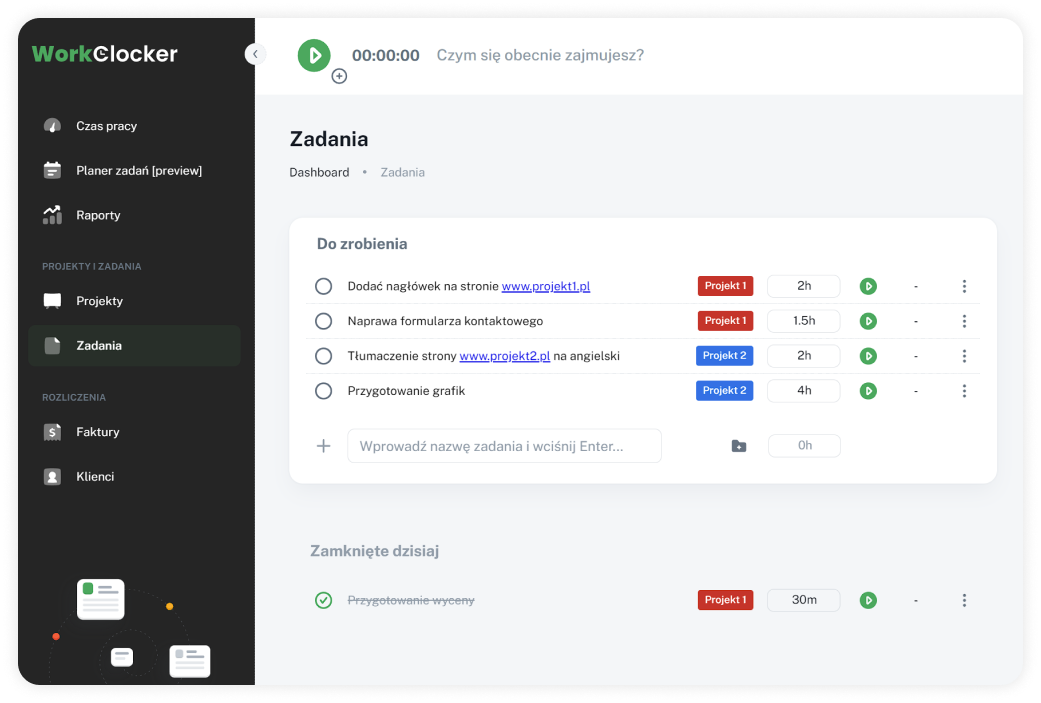 Rozpoczynaj mierzenie czasu pracy bezpośrednio z zadania.